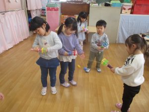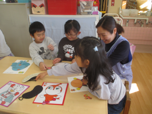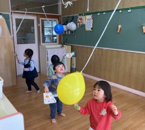 今日は全クラスが集合し、「あけましておめでとうございます!」の新年の挨拶をしてからコマやけん玉、福笑いなどのお正月遊びを楽しみました。