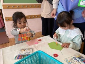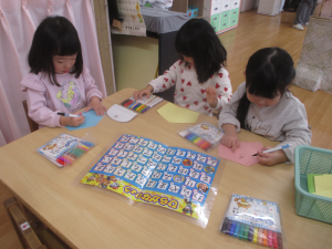 あいうえお表を見比べたり、友達と会話を楽しみながら願い事を書く子ども達でした。