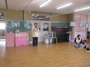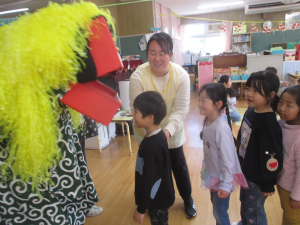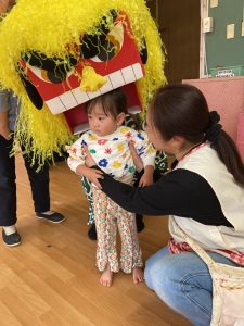 乳児クラスの子ども達は獅子舞の登場にビックリしていましたが、獅子舞が悪いものを食べてくれると1年間元気に過ごすことができるということを知っている幼児クラスの子ども達は、「獅子舞に頭を噛んでもらいたい人?」の質問に、「はーい!!!」と元気いっぱい手を挙げて、順番に頭を噛んでもらいました。