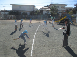 そして、園庭では本物の羽子板にも挑戦。「カーン!」という板に羽が当たる音が園庭中に響き渡っていました。
