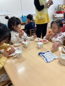 そして、午後のおやつも収穫したいちごやクリームをパンに挟んでフルーツサンドを作って、食べました。