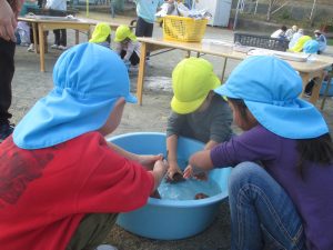 お友達と一緒にさつまいもの土を落とし、水は冷たいけどきれいに土を落としていました。