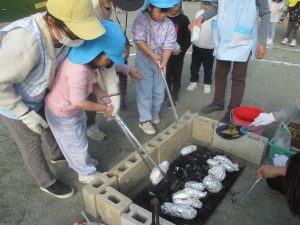 5歳児さんは、下準備したさつまいもを炭の上に長いトングで置き、うちわで火の番をお手伝い!!