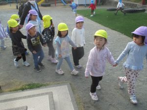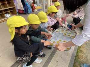 焼き場まで、グループのお友達と運び、焼けるまで3歳児クラスと4歳児クラスは一緒にお散歩へ!!