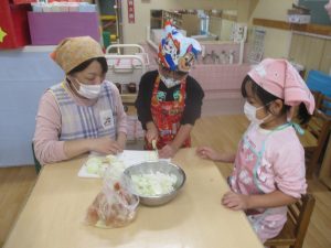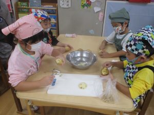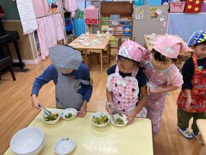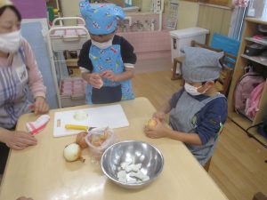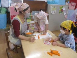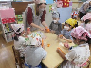 ピーラーを使うのは5歳児になって初めてでしたが、「お家でもやったことあるよ!」と自信を持って取り組んでいた子ども達です。