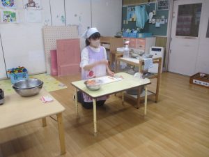 自分の食べられる量とお友達のことも考えながら真剣な表情でお皿に盛る子ども達でした。