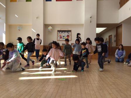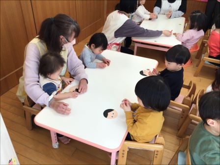 絵合わせゲームでは、5歳児と2歳児、4歳児と3歳児がペアになって「おひな様どこ?」と同じ絵を持っている友達を探しに行ったりと、仲良く異年齢での交流も楽しんでいた子ども達でした。