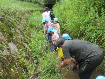 「滑るよ」「怖いな・・・」という声や、なかなか魚を捕まえることが出来ず「いないね・・・」という声もありましたが、徐々にコツをつかみ魚を捕まえることが出来ると「獲れた!!」と大喜びの子ども達。みんなで網の中の魚をのぞき込み観察をしていました。