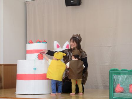 初めての発表会に緊張した様子もありましたが、いつものようにステージの上を歩き回り、ノンタンのために大きいイチゴを摘みケーキに飾り付けをしたり、ノンタンと一緒にかわいらしいダンスを踊ったもみじ動物たちでした。