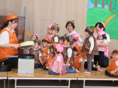 しろくまちゃんのために草むらのトンネルを抜け、ニワトリから産まれたての卵をもらい、牛乳と小麦粉、卵をボールの中入れ、泡だて器を使い混ぜ合わせてホットケーキの素を作りました。最後はフライパンからホカホカのホットケーキが出来上がり大喜びのかえで動物たちとしろくまちゃんでした。