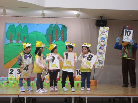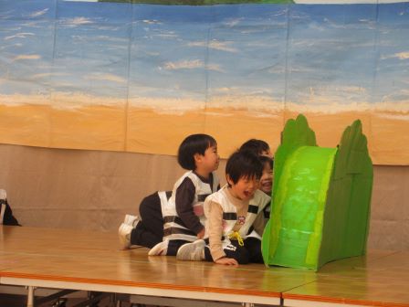 『ともだちや(お店)』を開店したこぶしきつね達。森のダンスを踊ったり、友達が欲しいオオカミと一緒にカード遊び“ハイ&ロー”を楽しみました。オオカミの出す問題にドキドキしている子もいましたが、友達と力を合わせて大正解!!最後はオオカミと本物の友達になった子ども達でした。