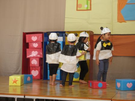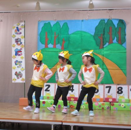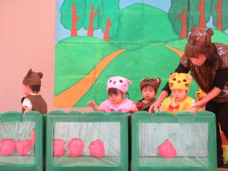初めての発表会に緊張した様子もありましたが、いつものようにステージの上を歩き回り、ノンタンのために大きいイチゴを摘みケーキに飾り付けをしたり、ノンタンと一緒にかわいらしいダンスを踊ったもみじ動物たちでした。