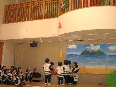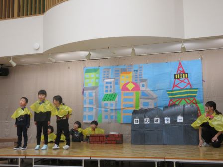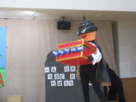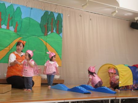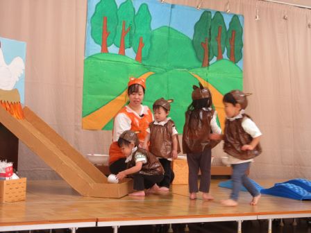 『ともだちや(お店)』を開店したこぶしきつね達。森のダンスを踊ったり、友達が欲しいオオカミと一緒にカード遊び“ハイ&ロー”を楽しみました。オオカミの出す問題にドキドキしている子もいましたが、友達と力を合わせて大正解!!最後はオオカミと本物の友達になった子ども達でした。