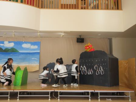 鬼に盗まれたはちまきを取り返す為、さくら太郎になって登場!元気の出るキビ団子をキジさんに届けてもらい元気モリモリになったさくら太郎たち。いざ鬼の元へ!鬼が寝ている間にはちまきを取り返しに行ったのですが、たまに起きる鬼にドキドキしながら友達と一緒に草むらに隠れたり、見つからないようにしていたさくら太郎たち。無事はちまきを取り返すことが出来ました。