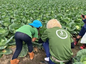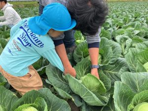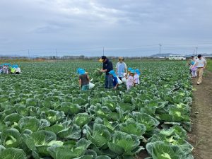 見渡す限りに広がるキャベツ畑では、農家の方に手伝ってもらいながら、1人2つ収穫しました。