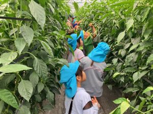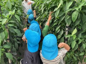 ピーマンは、食べごろの物を見極めて、背伸びして収穫した子ども達。