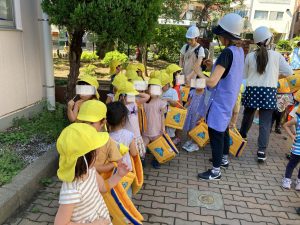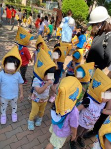 今月は、地震が起きた後に、近隣からの火災を想定して避難をしたのですが、子どもたちから「火事だから煙が口にはいらないようにしないとね」という声も聞こえてきました。日ごろの積み重ねの成果が出ているようです。