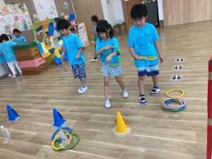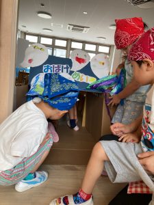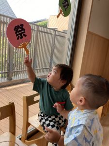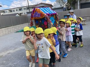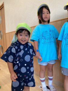 前日の31日(木)は園庭で《こどもみこし》を勢いよくしらかば組の子ども達が担いで廻り、「ワッショイ!ワッショイ!」とみんなで声を出して盛り上がりました。♪ドラえもん音頭の曲で明日の本祭りを楽しみにみんなで盆踊りをしました。